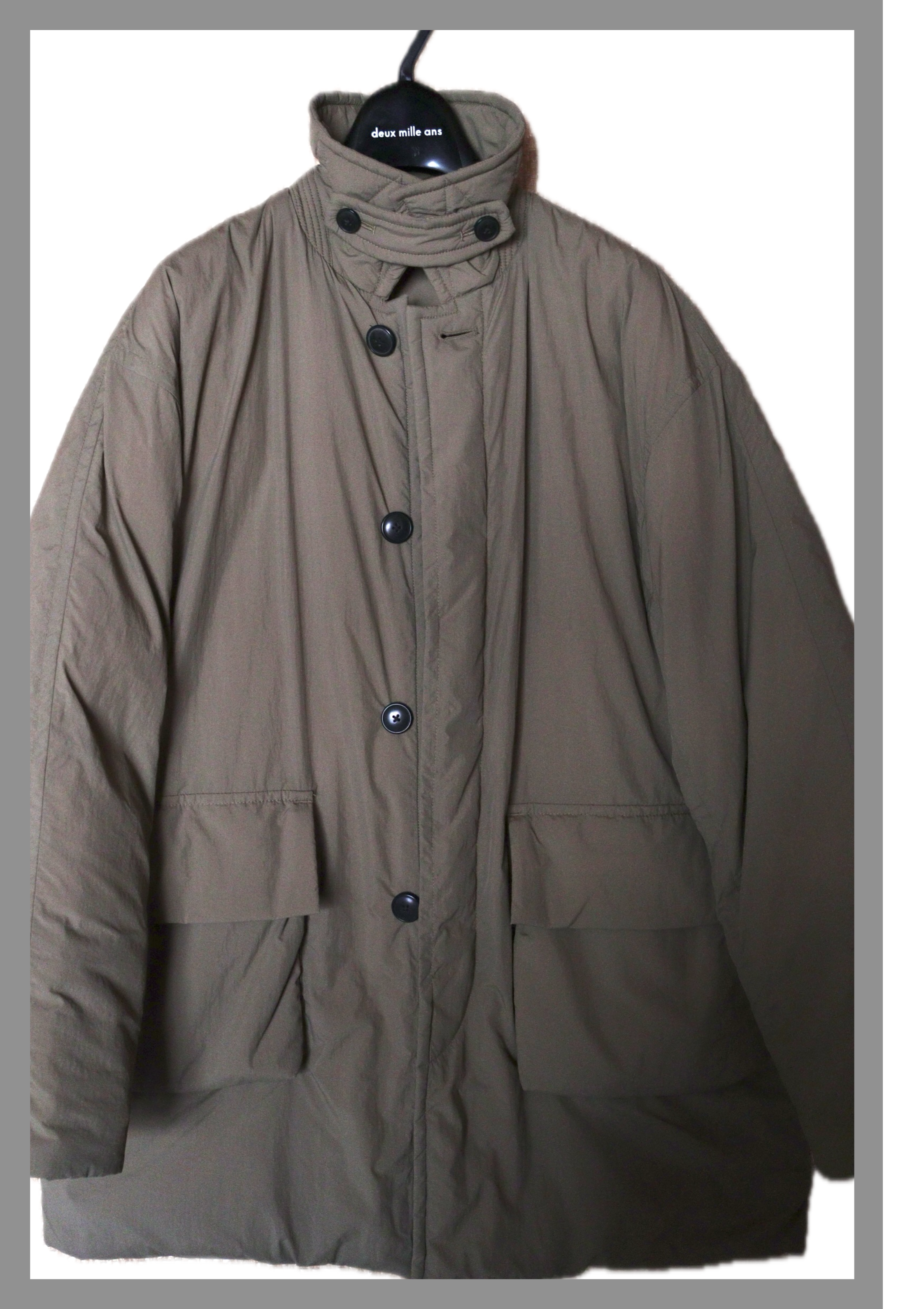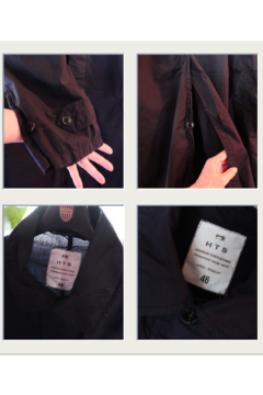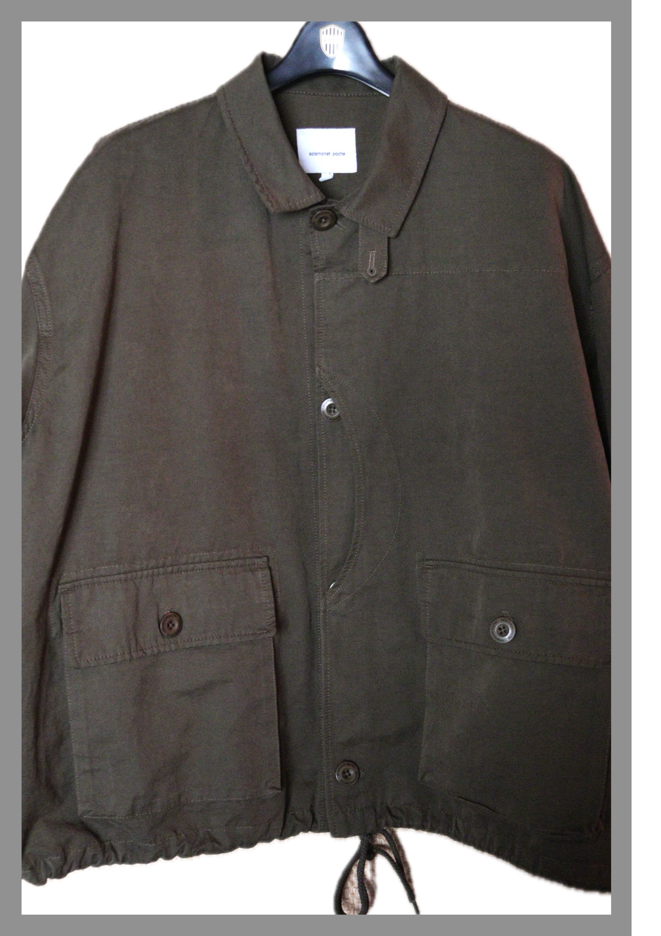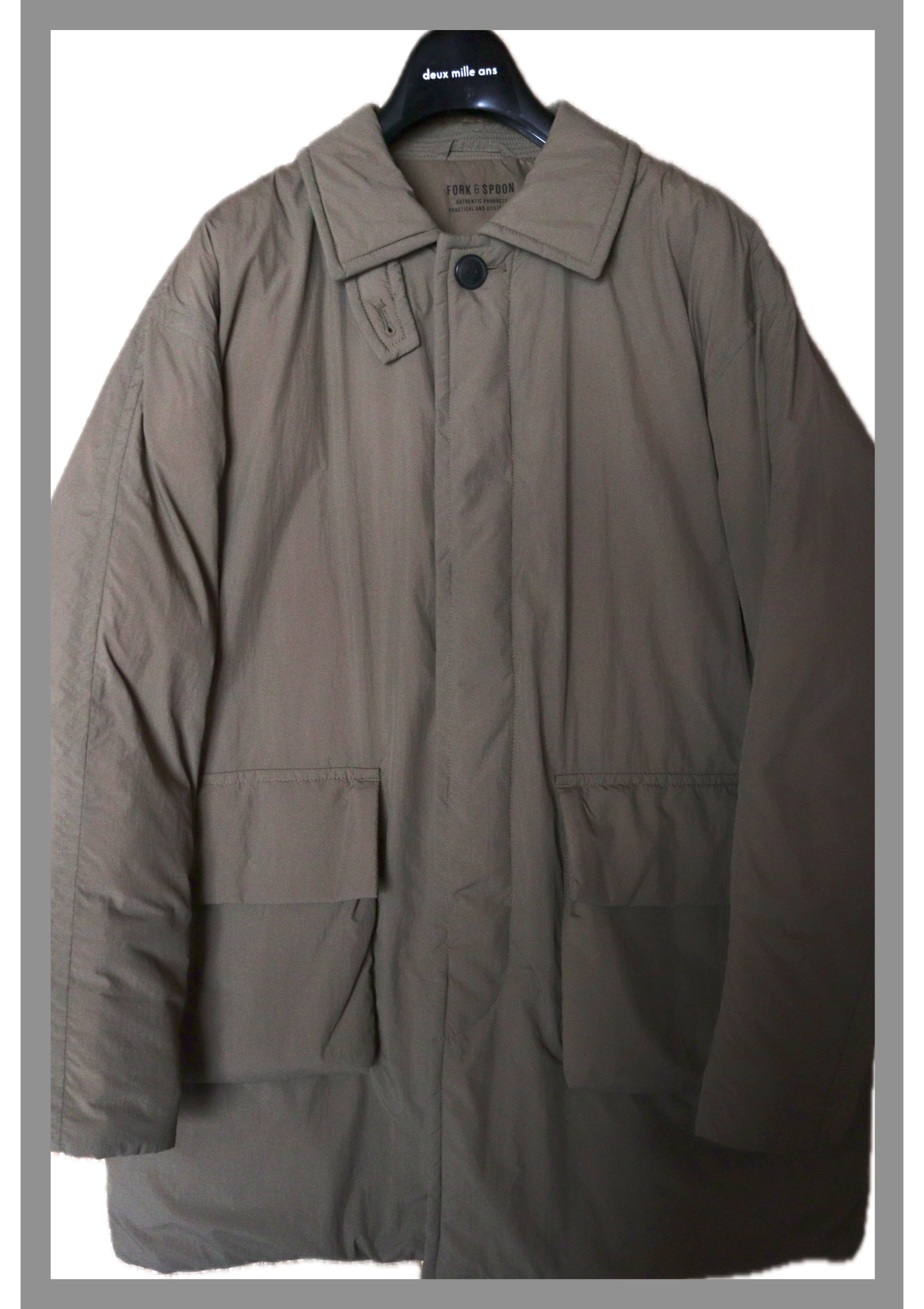 冬から春の変わり目に着る感じのミリタリーなハーフコート。わかりにくいですが今流行り(?)のオイリーな生地で、ダボっとしたシルエット。裾を絞るとまた違う感じに。